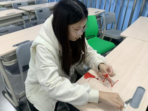 手工創作環節中,團員們拿起紅繩與珠飾,在團支書指導下認真編織。從最初的生疏到逐漸熟練,大家在反復練習中掌握技巧,將對美好生活的期許融入每一個繩結。有的團員搭配珠飾制作出小巧精致的掛件,有的在傳統結型基礎上融入創意巧思,讓古老的中國結煥發出青春活力。班委穿梭于各組之間,耐心解答疑問、協助調整繩結,幫助團員順利完成手作體驗。