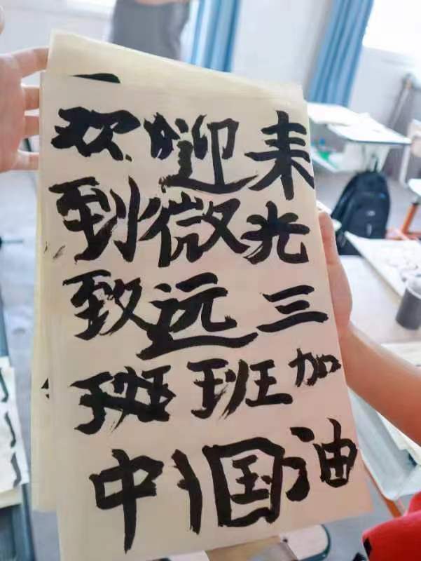 小朋友們還跟隨賴麗羽老師和安耀堂老師學習寫毛筆字。老師們先講述了書法相關知識,學生們也非常認真,安靜、仔細地聽課。隨后,老師們讓學生自己嘗試寫字,并展示自己的作品。同學們思維活躍,行云流水,揮灑筆墨,最終得到獨一無二的作品。