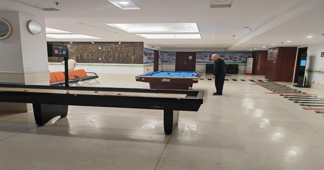 團隊成員上午到達西郊協和頤養院,一進門就能感受到這個養老院的面積較大,基礎設施比較完善。西郊協和頤養院位于新涇鎮協和路,遠離城市的喧囂,老人們三三兩兩在樹蔭下坐著,享受安靜的午后時光。在養老院負責人的帶領下,團隊成員來到頤養院的二樓。一位爺爺正在打臺球,爺爺的精氣神令團隊成員感到意外。