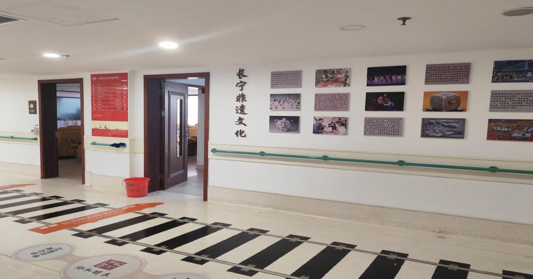 在參觀的過程中,團隊成員發現西郊協和頤養院將非遺手工藝制作融入了老人的日常活動中。在養老院的二樓走廊上,墻面貼著對長寧非遺文化的詳細介紹,老人們在日常生活中也能了解和學習到非遺文化。通過傳授老人非遺技藝,如刺繡、陶藝、編織等,觀看《國家寶藏》等弘揚中國非遺文化的節目,養老院不僅讓老人感受到了自己的價值,也讓非遺手工藝得到了傳承和發展。