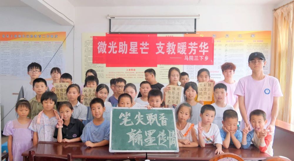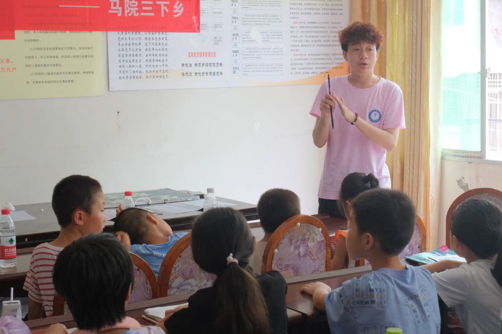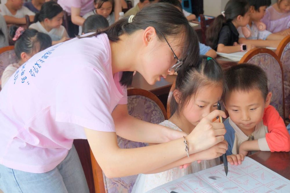 縱觀古今,讀書聰慧,通史增智,練字養心。實踐隊員以深入淺出的方式講解筆畫技法、結構規律和章法,向同學們介紹如何品味一幅書法作品之美。“要學好書法,筆畫是基本功。大家一定要牢記永字八法中‘側、勒、弩、趯、策、掠、啄、磔’的書寫方法,還要掌握正確的站姿、起筆、運筆等書法要領,從而感受書法文化蘊含的民族精神。”實踐隊員董然說道。她之所以選擇“筆尖飄香,翰墨傳情”這一主題,是為了讓學生們能在學書法的過程中,感受翰墨濃香,也希望能給留守兒童鄉村生活帶來知識和快樂,“非寧靜無以致遠”,學生們在寫字中也能修生養性,吸取傳統文化中的精神養分,讀好書,寫好字,做好人。