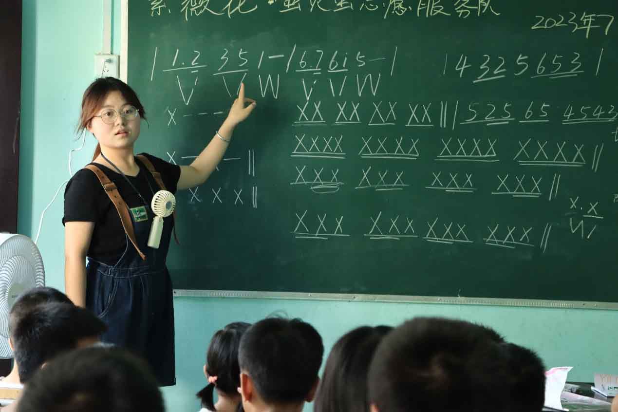 圖為螢火蟲志愿隊員在為小朋友們上一堂生動的音樂課,優(yōu)美的旋律使得大家都沉醉在音樂的海洋之中。(圖 黃思進)