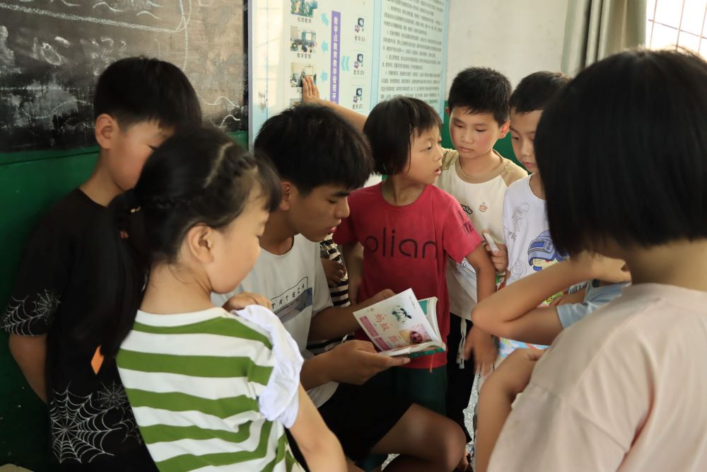 圖為紫薇花·螢火蟲暑期志愿服務隊隊員為駱莊村小學生宣傳生態保護戰略。通訊員黃思進供圖