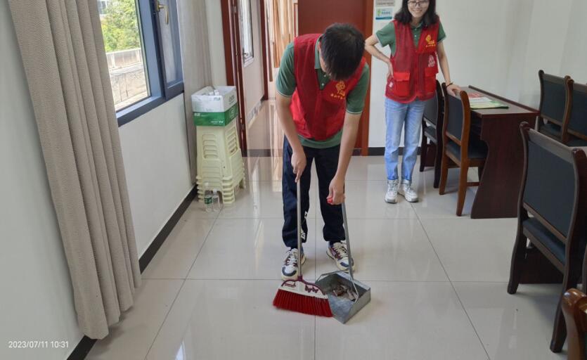 圖為社會實踐團隊成員在幫助社區(qū)清掃宣講會議室