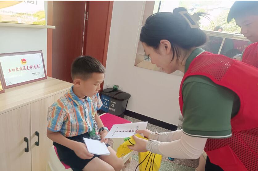 圖為社會實踐團隊成員向社區(qū)小朋友發(fā)放宣傳手冊