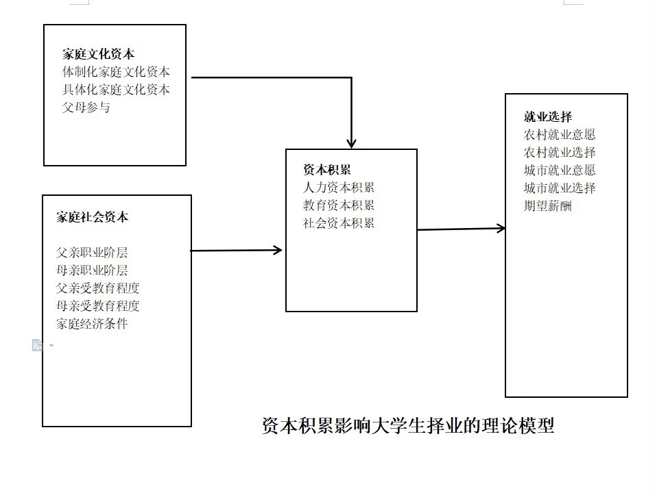 團隊成員結合相關文獻資料,梳理了諸多資本對于大學生就業觀影響的脈絡關系。具體來說,家庭社會資本,實際上就是父母職業階層,父母受教育程度,以及家庭的經濟條件。基于代際交流理論,家庭經濟條件影響著個人經濟地位及職業的繼承。而家庭文化資本指的是一個家庭所擁有的教育背景、價值觀、知識和社會關系等方面的資源,對大學生擇業有著重要的影響。