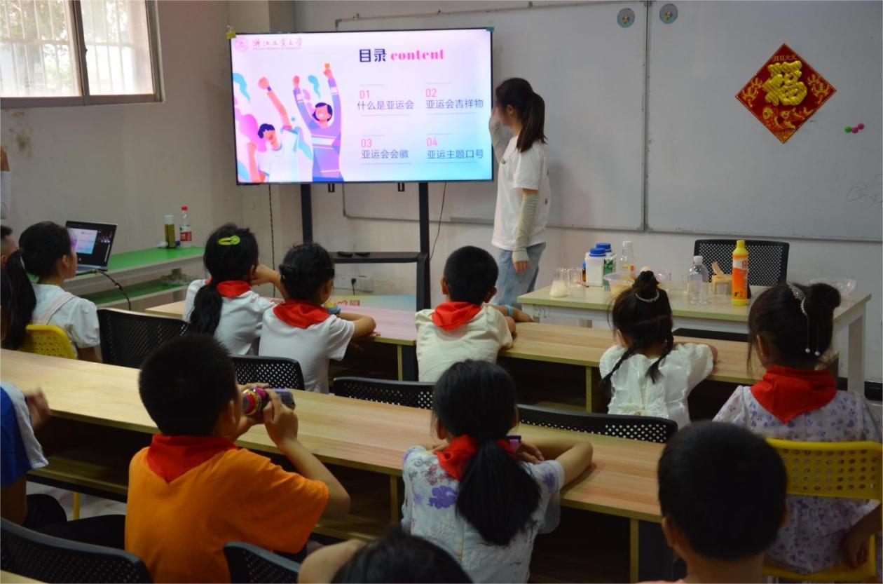“什么是亞運會”、“亞運會的會徽有什么含義”、“亞運會吉祥物有哪些”、“亞運會的口號是什么”,實踐團成員應安琪先為孩子們播放了亞運會宣傳視頻再針對其中四個問題進行了詳細的介紹,孩子們聚精會神,面對安琪老師的提問,孩子們也相當熱情與積極。