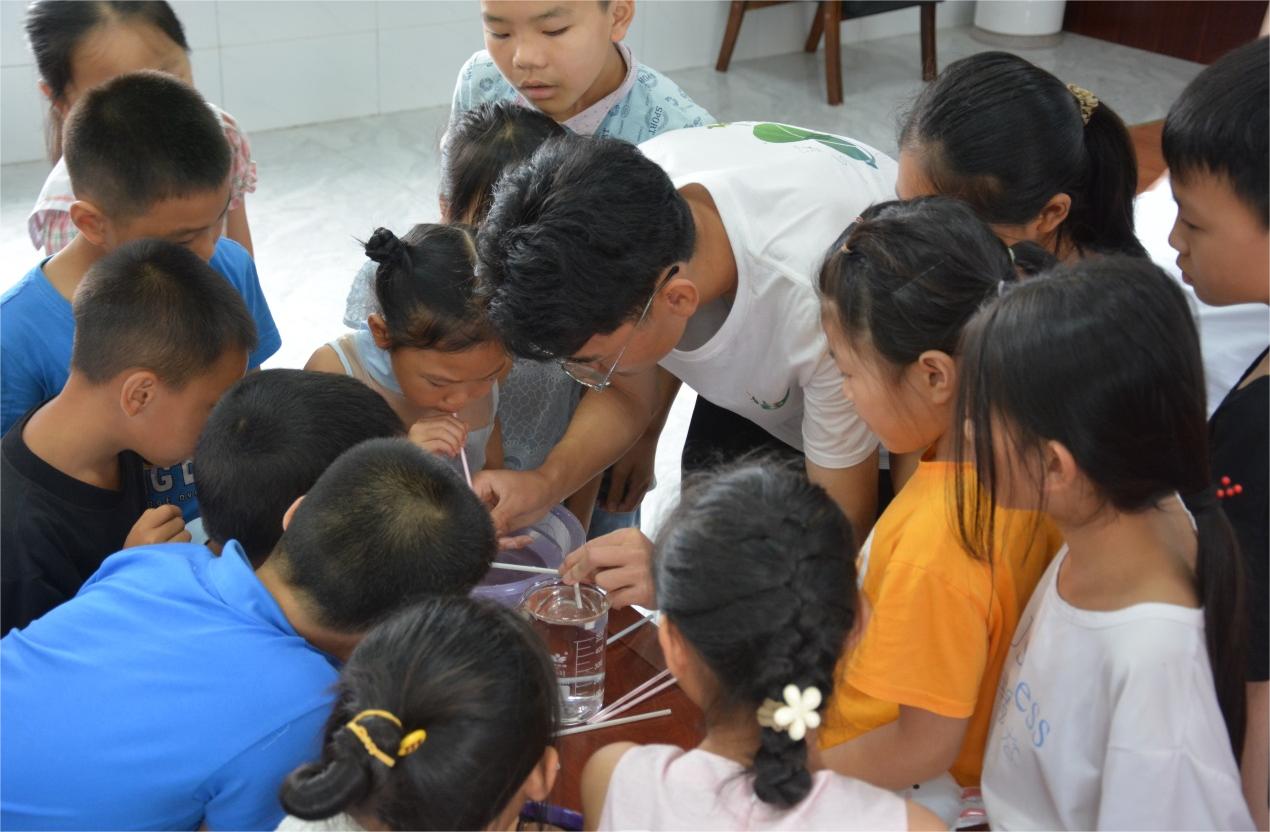 實踐團隊長雷毅正帶著孩子們一起做實驗(成員李陽 攝)
