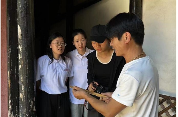 7月15日,團隊成員聞奕、王淑禾等人前往古鎮慈城調研當地文化振興成果并宣傳詩意語文概念。慈城,史稱"句余"、"句章"、"慈溪城",是浙東名邑慈溪的老縣城,具有豐厚的文化底蘊,有“中國歷史文化名城”、“中國首個慈孝文化之鄉”之稱。因此,團隊成員選擇此處作為實踐走訪的目的地,尋訪慈城的非遺傳承人、退休語文教師等文化教育事業的資深從業者,并向當地村民介紹團隊正在開展的詩意語文支教課堂。螺鈿鑲嵌傳承人邵益達老先生向團隊成員表示認可,并寄希望于更多的年輕人也能參與進來,發揚和傳承中華優秀傳統文化。