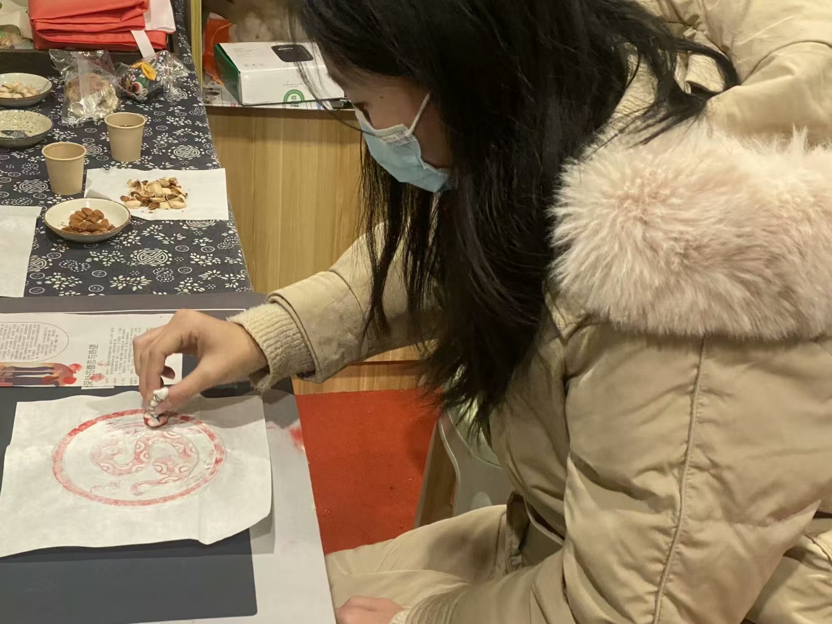 為了更好地宣傳中國民間傳統文化,十笏園不僅提供了傳統剪紙和拓印藝術的展覽窗口,還設置了可以親手制作的學習窗口。實踐隊隊員來到親手制作攤位跟隨工作人員學習剪紙和拓印。在這個過程中,實踐隊隊員對于剪紙藝術和拓印藝術有了更近一步的了解,剪紙和拓印藝術不再是只可遠觀的傳統藝術形式而是可以觸碰到的藝術.