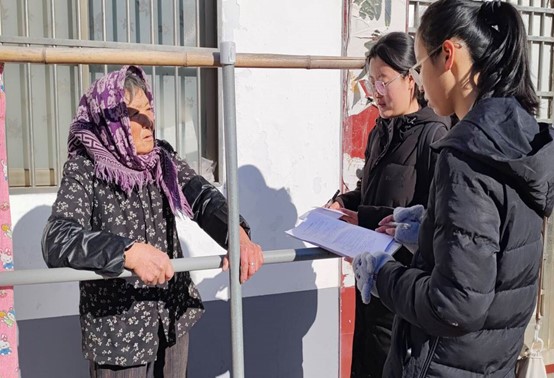 圖 2為隊員對秦家官莊村農戶進行問卷調查。陳慶霞 供圖2025年1月10日至1月11日,實踐隊員分成兩隊,分別前往秦家官莊村、金家湖、陶家村等地的村委會,向村書記說明調研計劃并獲得支持。兩隊隊員分成2至3組,前往各村不同方向進行調研,走訪對象包括村內常住農戶、茶廠老板、外出務工人員等,為擴大調研范圍,輔以進行線上問卷調查。