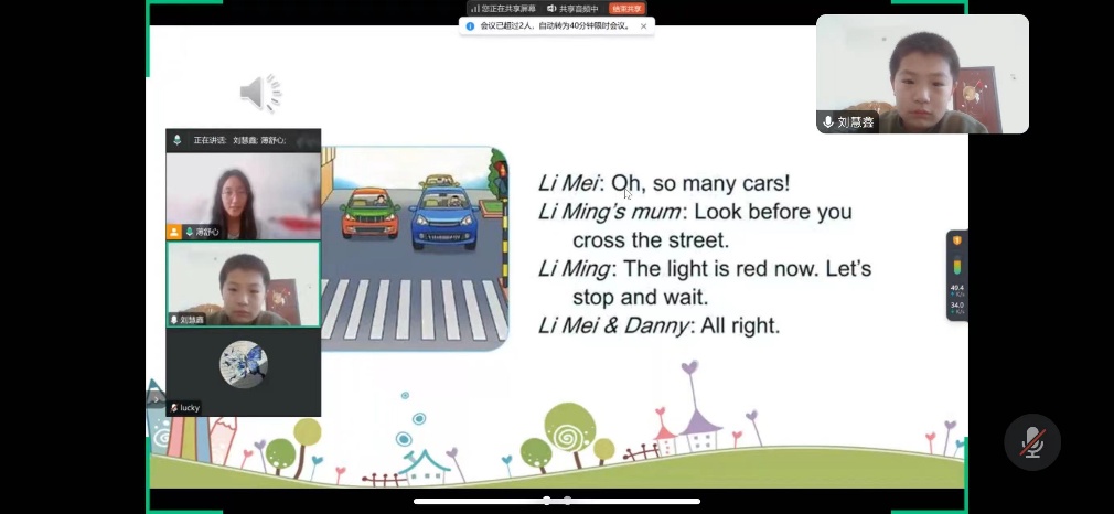 語文課上,志愿者老師帶領孩子們走進經典文學作品。通過在課上對古詩詞、課文等的深度剖析,以及志愿者老師憑借著富有感染力的吟誦,傳遞出詩詞的韻味,再層層剖析字詞的意思,引導學生體會詩人們的情感與思想,培養學生對文學作品的喜愛,同時也培養了他們的閱讀理解和文學鑒賞的相關能力。在課堂上,學生積極參與互動,分享其對詩詞的獨特理解,志愿者與孩子間的交流使得思維的火花得到不斷地碰撞。英語課堂上同樣精彩紛呈,志愿者老師營造沉浸的語言環境,同時志愿者準備了詳細的課件,在屏幕上展示出相關的詞匯與句型的教學內容,在講課中志愿者耐心的帶領學生進行朗讀和理解,用著標準地道的發音以及生動有趣的互動環節,將學生們帶入英語的世界,充分激發孩子們的學習熱情,讓他們克服語言羞澀,自信地開口表達。以上的情景發生在每一個志愿者的課堂上,他們與孩子通過騰訊會議上的連麥積極互動,培養了孩子們的學習興趣。