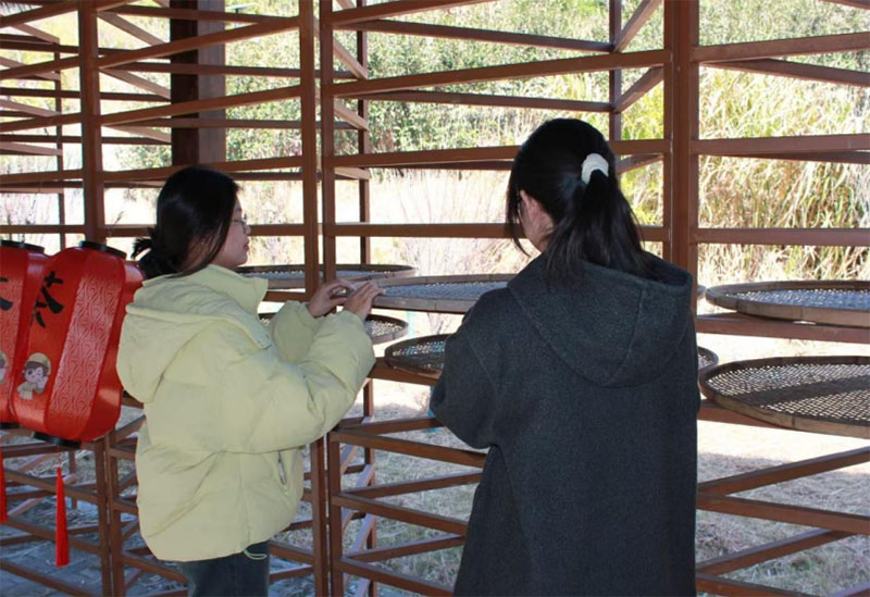 第二站:梧溪村茶廊 隨后,實踐隊來到了梧溪村茶廊及北寮村茶主題公園。梧溪村茶廊設計古樸,與茶文化元素融合。木質廊柱掛有與水仙茶相關詩詞,壁畫呈現水仙茶種植、采摘、制作流程,展現其悠久的歷史。