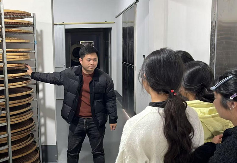 第四站:漳平市四方君茶葉有限公司 在漳平市四方君茶葉有限公司,非遺大師沈添星及其子沈達銘接待了實踐團隊,詳細闡釋了漳平水仙茶的制作流程。從鮮葉采摘時對茶青嫩度、采摘時機的嚴苛要求,到萎凋階段對溫濕度的精確調控,再到做青、殺青、揉捻、造型、烘焙等一系列繁復工序,每一環節皆凝聚著深厚技藝與匠人們的心血。實踐隊在沈氏父子引領下參觀了茶葉制作車間,實地觀察了現代設備與傳統手工技藝融合的生產作業,深切體會到傳統工藝在當下的傳承與創新。
