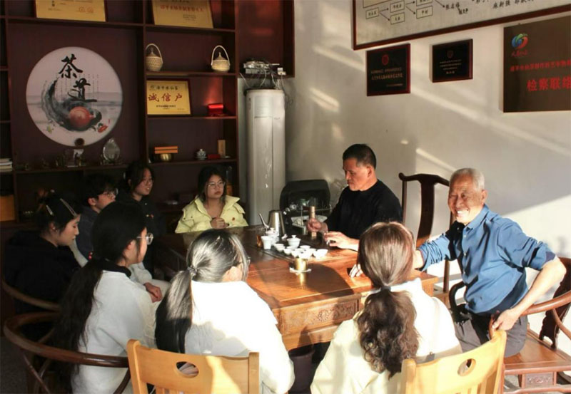 第五站:漳平市士安茶廠 隨后,實踐隊抵達漳平市士安茶廠,談及銷售模式,傳承人張士安介紹到,公司在穩固傳統線下銷售渠道,如與各地茶葉經銷商、茶館建立合作的同時,積極開拓線上銷售途徑。他認為,善用新媒體平臺宣傳至關重要,通過制作精良的短視頻,展示水仙茶制作流程、獨特風味及背后的茶文化故事,能夠吸引更多年輕消費者的關注。