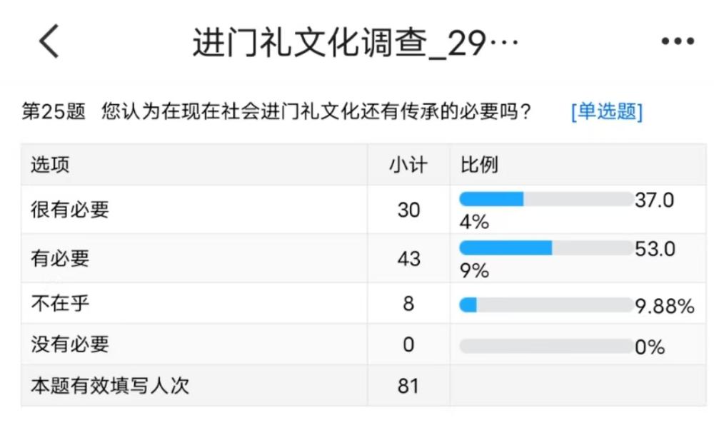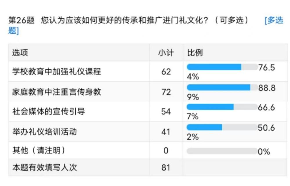 圖為實踐隊線上調研問卷部分調研情況截圖 中國青年網通訊員韓昊宇 供圖 家庭是傳承門禮文化的第一陣地。家長必須以身作則,在日常生活中嚴格遵循門禮規范。比如,教育孩子進門前務必先敲門,得到允許后再進入房間;教導孩子以熱情、禮貌的態度在門口迎接客人。通過日常生活中的言傳身教,讓門禮文化在孩子幼小的心靈中深深扎根。