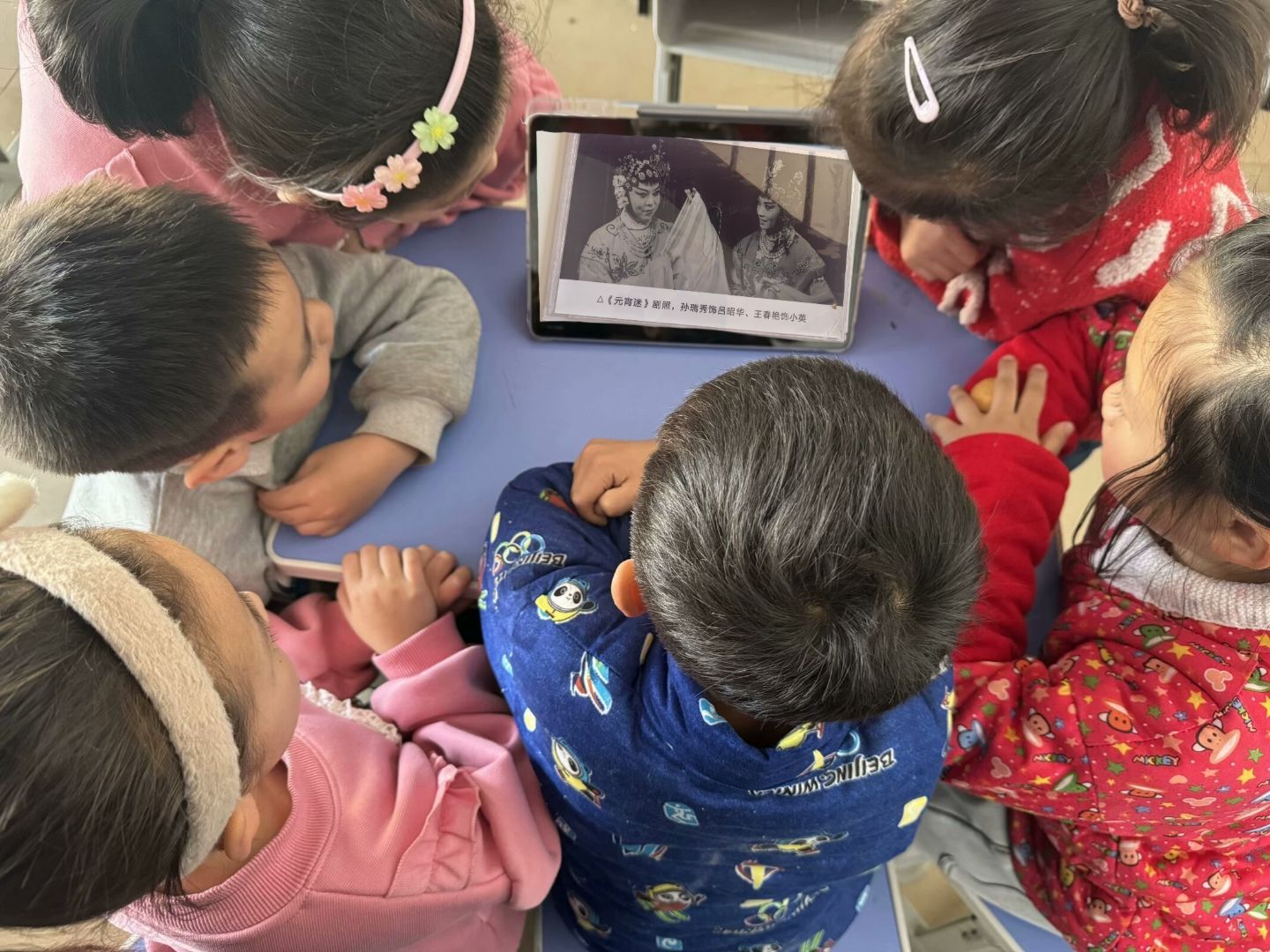 圖為小朋友們翻看隊(duì)員們實(shí)踐時(shí)所拍的茂腔劇照。楊轢文 供圖