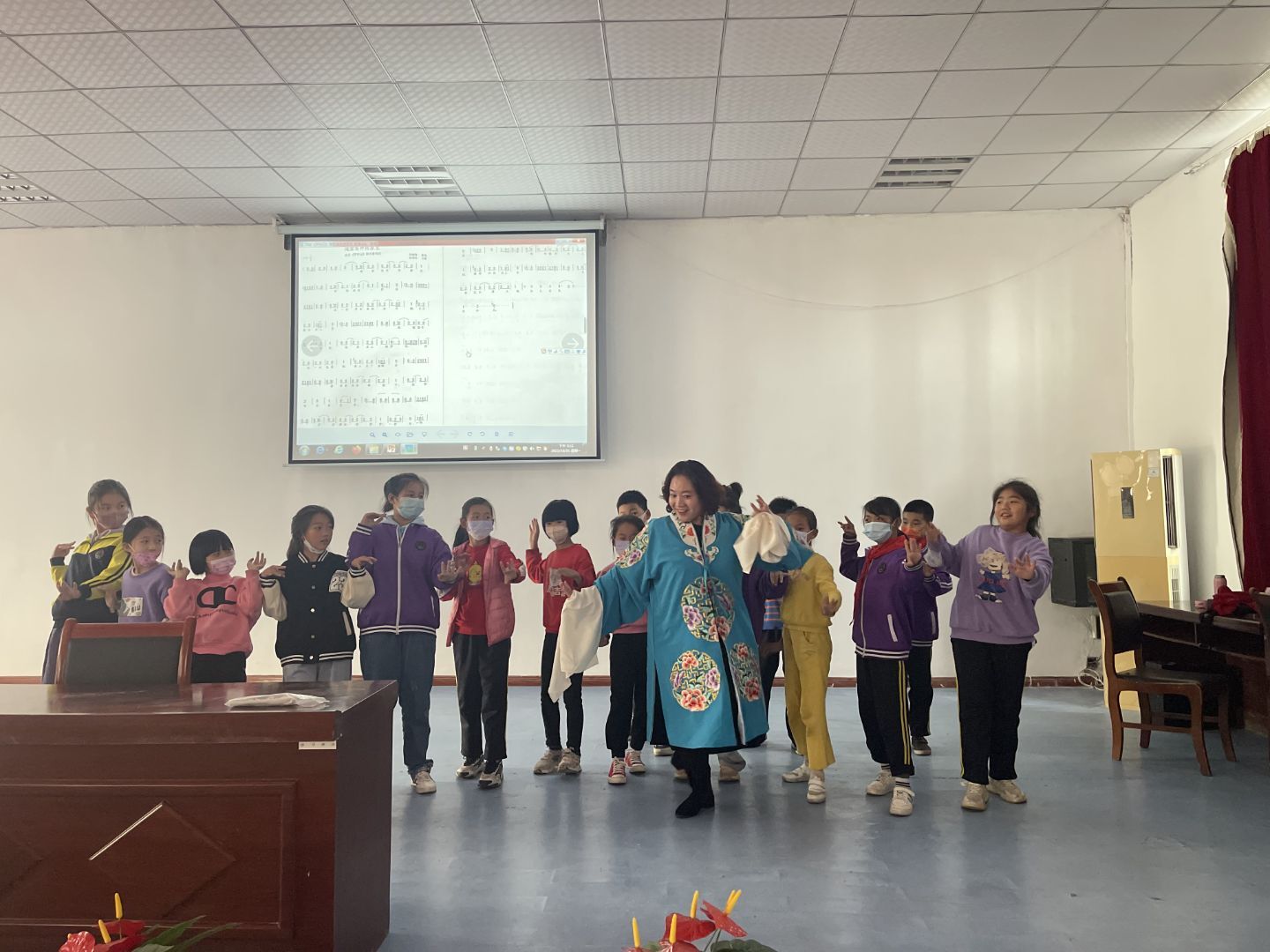 圖為賢繼紅老師帶領同學們親身感受和學習茂腔的動作和唱腔。張昕 供圖