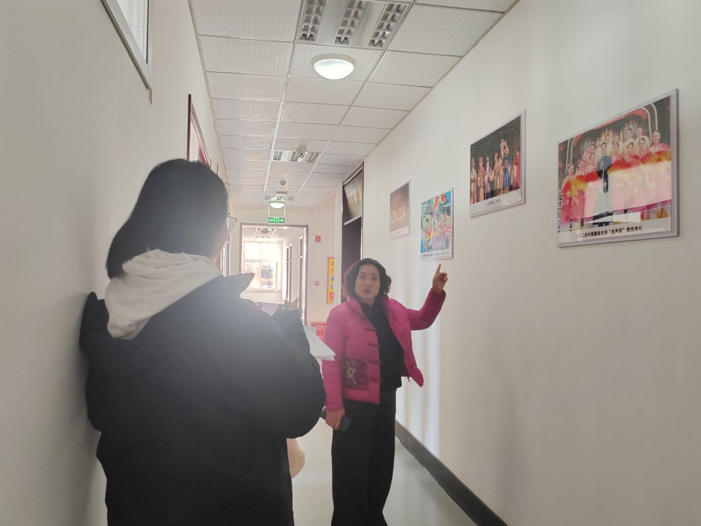 圖為賢繼紅老師為實踐隊員結合在走廊上展出照片介紹其背后的故事。張昕 供圖