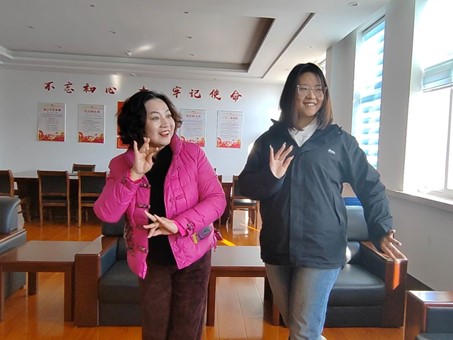 圖為實踐隊員與賢繼紅老師在青島市茂腔劇團門口見面。尉藝凡 供圖