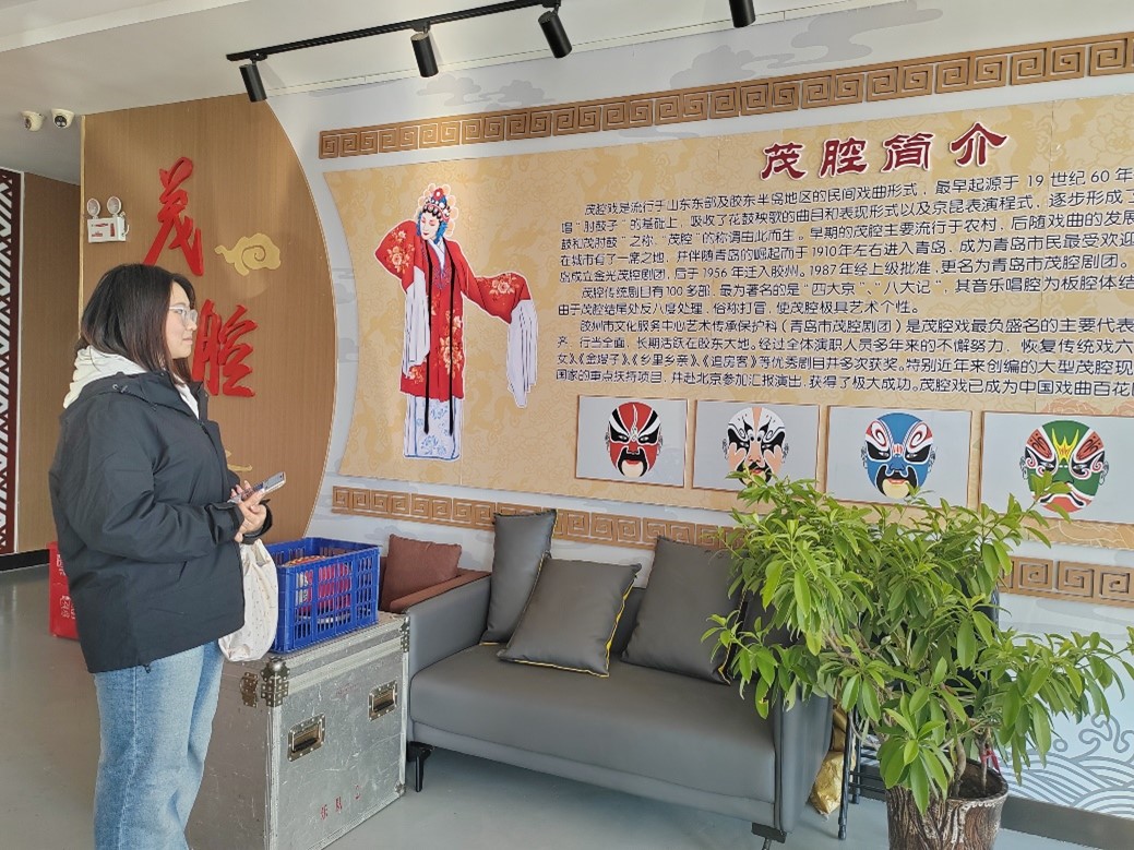 圖為實踐隊員通過青島市茂腔劇團大廳內宣傳欄內的材料學習茂腔相關知識。張昕 供圖