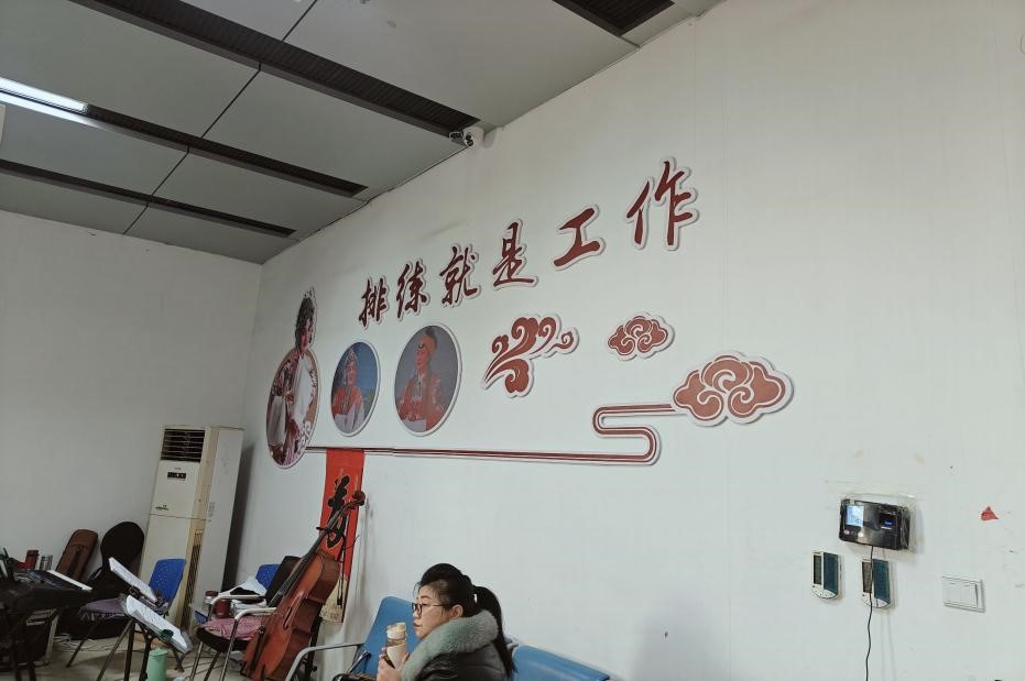 圖為社會實踐隊成員與劇團老師探討茂腔與現代音樂、舞臺藝術、多媒體技術結合等創新發展路徑。許田雨 供圖