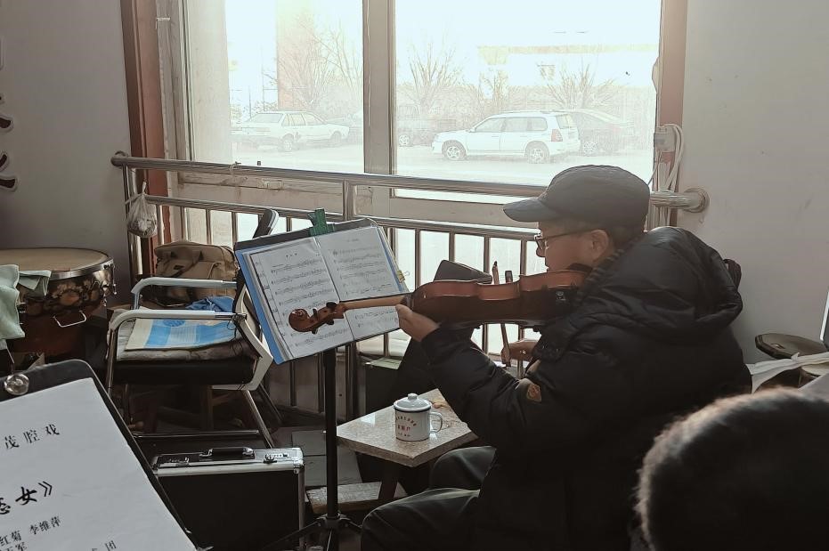 圖為社會實踐隊成員聆聽老藝術家曲譜《緊急時刻》排練。許田雨 供圖