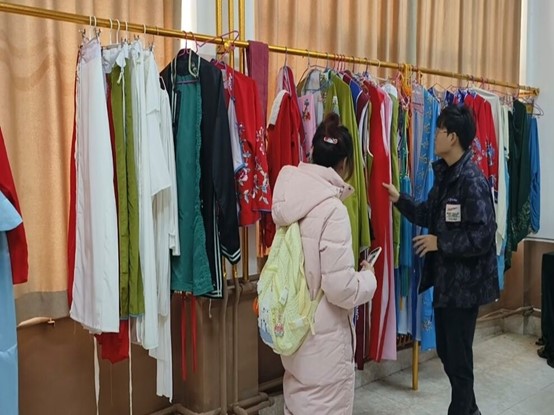 圖為實踐隊員了解茂腔戲服,它們主要在演員表演一些傳統(tǒng)劇目時被穿著。王中貞 供圖