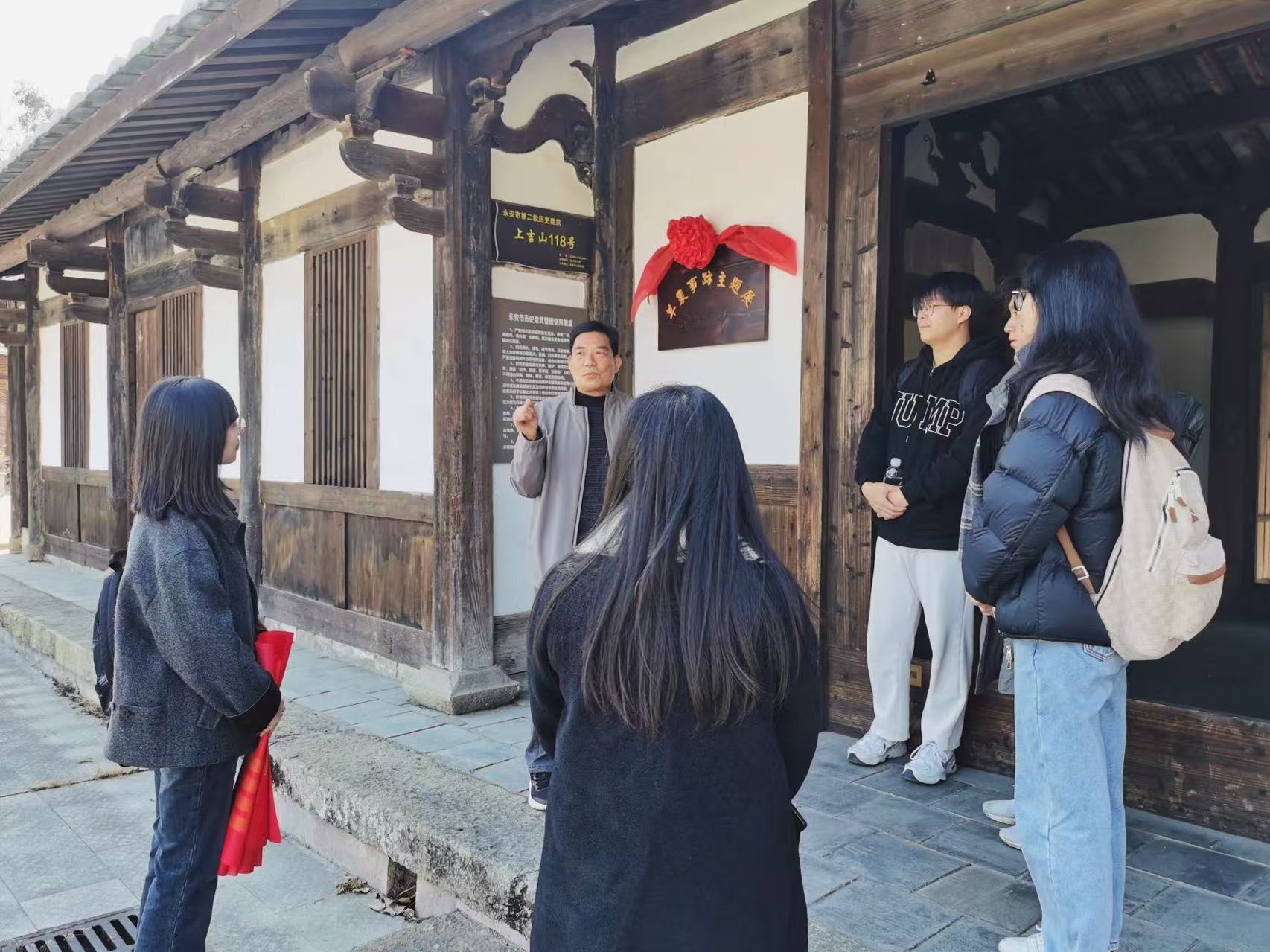 在永安當(dāng)?shù)匚氖穼<伊_聯(lián)永老師的帶領(lǐng)下,實(shí)踐隊(duì)首站來到吉山村抗戰(zhàn)遺址群。這里保存著許多抗戰(zhàn)時(shí)期的建筑設(shè)施,如省政府辦公廳、省立永安師范等地點(diǎn)。羅老師帶領(lǐng)成員們參觀了戰(zhàn)時(shí)新聞?lì)I(lǐng)軍者羊棗、鄒韜奮的事跡主題展,并介紹了他們與永安結(jié)緣的故事,追溯他們舍生取義的斗爭(zhēng)歷程。在參觀和聆聽過程中,成員們了解了永安在全國(guó)抗戰(zhàn)文藝史、新聞史上做出的獨(dú)特貢獻(xiàn),也深切體會(huì)到當(dāng)年先輩們生活條件的艱苦。隨后,實(shí)踐隊(duì)移步永安國(guó)立福建音樂專科學(xué)校舊址,走進(jìn)校史展覽館了解其悠久歷史,并做了詳細(xì)記錄。羅老師還指導(dǎo)成員們學(xué)習(xí)了抗戰(zhàn)曲目《永安之夜》的演唱方法,成員們切身感受著先輩們抗戰(zhàn)的激情與熱血,也必將這些寶貴的文藝資源傳承下去。