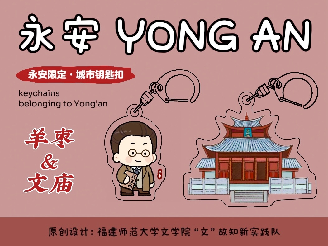 行有所悟,學(xué)有所用。實(shí)踐過后,成員們?cè)O(shè)計(jì)了羊棗、文廟的文化IP,將實(shí)地調(diào)研中感受到的先輩們不懼困難、迎難而上的愛國(guó)精神和永安當(dāng)?shù)靥厣叵嘟Y(jié)合,制作了“永安限定”系列鑰匙扣、帆布包等相關(guān)文創(chuàng)產(chǎn)品。成員們希望能夠以新一代青年喜聞樂見的傳承方式,使永安紅色文化資源在新時(shí)代重新煥發(fā)出生機(jī)活力,為永安抗戰(zhàn)精神的發(fā)揚(yáng)傳播、城市名片的打造、文化地位的提升貢獻(xiàn)自己的青春力量。