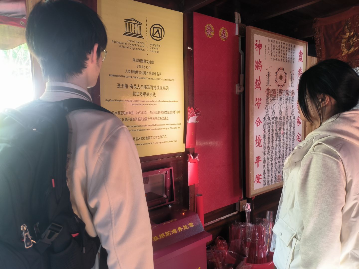 為了深度探尋疍民習(xí)俗,領(lǐng)略疍家風(fēng)情。實(shí)踐隊(duì)?wèi)阎鵁岢琅c好奇,深入疍民社區(qū),全神貫注地觀看關(guān)于漳州疍民習(xí)俗的介紹,其中,承載著疍民信仰與文化的進(jìn)發(fā)宮,以及送王船這一民俗活動(dòng)引起了隊(duì)員們的濃厚興趣。