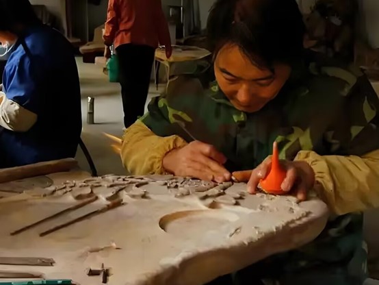 圖為紅絲硯制作互動展區大師正在雕刻硯臺。