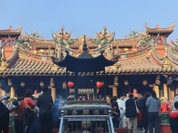 1月23日,閩南地區實踐隊員來到了泉州鯉城的通淮關岳廟,觀看祈福儀式。當地人民擺上準備好的糕點、水果,點上三柱香,按順序敬拜廟中諸神,帶著滿滿的誠心向神明祈求,希望來年能夠順風順水。在這里,實踐隊不僅能感受到人們對美好生活的期盼,更能感受到閩南獨特的紅磚古厝風格和濃厚的煙火氣息。