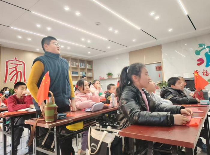 交流片刻,給小朋友們分發了我們帶的小國旗和學習海報,我們的課程便正式開始了。陽光澆灌著這些小花們,我們為他們施肥。