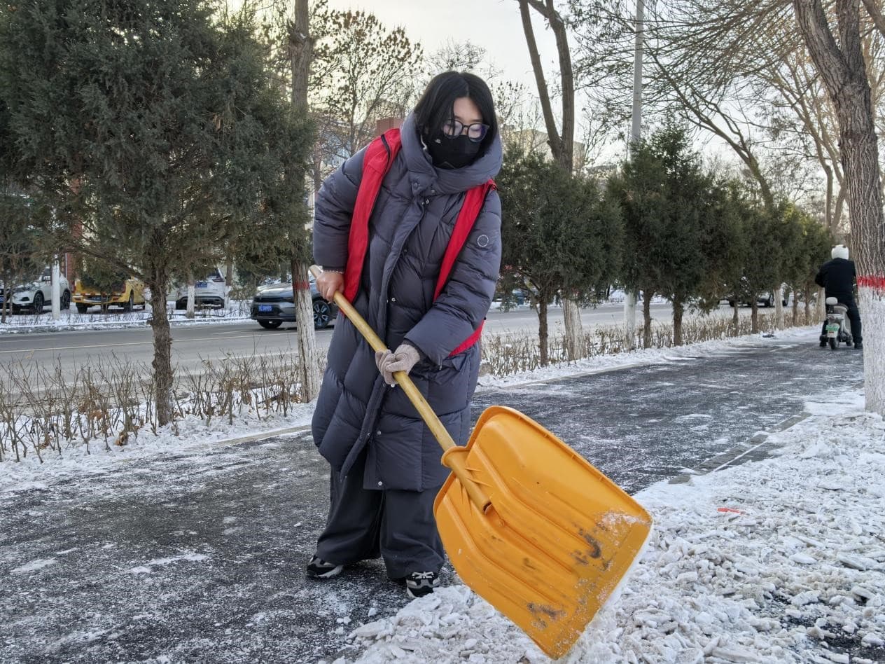 圖為江蘇科技大學海洋學院實踐團成員孫藝瑋進行鏟雪除冰活動。今日大學生網通訊員孫藝瑋 供圖