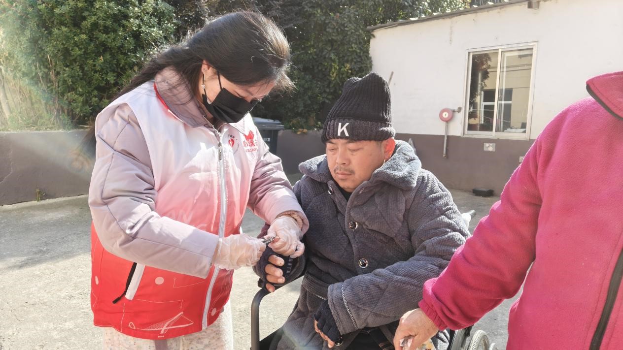圖為江蘇科技大學海洋學院實踐團成員朱俁祺在敬老院照料老人。今日大學生網通訊員 朱俁祺 供圖