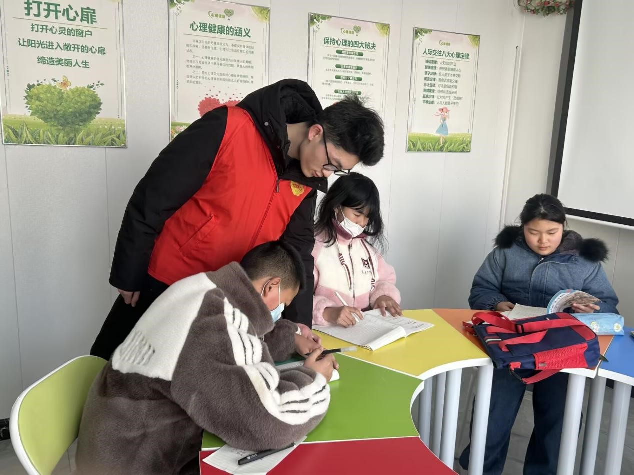 圖為江蘇科技大學海洋學院實踐團成員蔡守建指導小朋友學習。今日大學生網通訊員蔡守建 供圖
