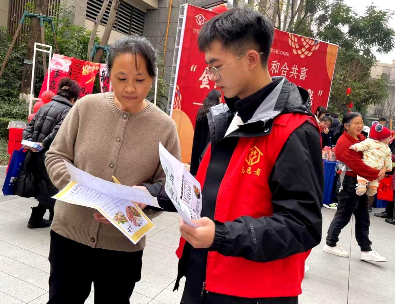 實(shí)踐團(tuán)隊(duì)深入家鄉(xiāng)各個(gè)社區(qū),開展膳食宣講活動(dòng),為加大膳食健康的宣傳力度,實(shí)踐團(tuán)隊(duì)將春節(jié)與膳食文化相結(jié)合,邀請(qǐng)了書法老師,現(xiàn)場(chǎng)為居民題寫富有傳統(tǒng)文化內(nèi)涵的春聯(lián),吸引了廣大居民的到來。隨后,團(tuán)隊(duì)成員以通俗易懂的語(yǔ)言向居民科普膳食知識(shí),并根據(jù)不同年齡段特點(diǎn),給出個(gè)性化的飲食建議。