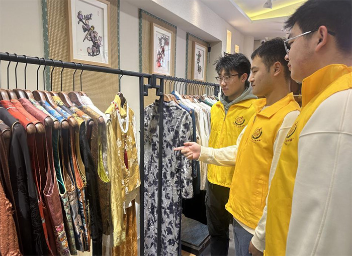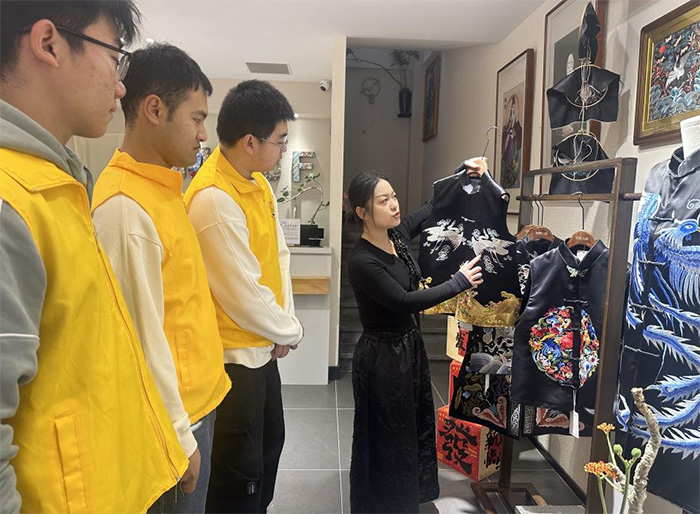 滿族刺繡與新中式服飾作品琳瑯滿目,每一針每一線都訴說著民族的歷史與故事。實踐團成員認(rèn)真聆聽服飾設(shè)計的講解,從平針、纏針到打籽繡,這些復(fù)雜的設(shè)計讓實踐團成員們驚嘆不已。