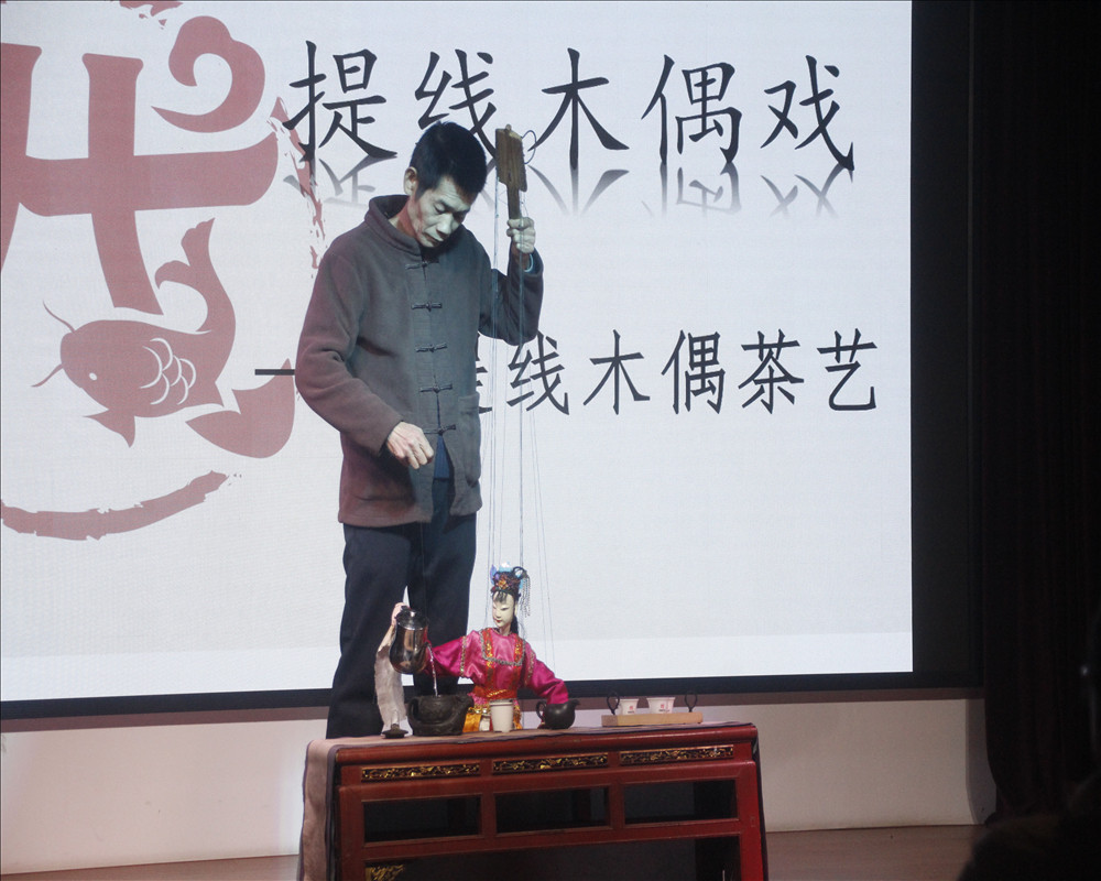隨后,實踐隊走進戲鯉茶樓,與木偶戲省級非遺傳承人楊章火老師會面。作為非遺技藝的堅守者與創新者,楊老師將提線木偶與閩南工夫茶融合,首創木偶茶藝表演新形式。南音悠揚間,其操控絲線演繹木偶茶藝,行云流水的表演詮釋出“纖絲牽雅韻,古藝潤茶香”的獨特魅力,讓傳統木偶戲在當代煥新彩。實踐隊隊員為楊老師的匠心與創新所震撼,更深刻體會到非遺傳承中堅守與突破的重要意義。躍躍欲試的隊員們在老師指導下親手執線,才發現看似簡單的動作背后藏著萬般巧勁,真切體會到“臺上一分鐘,臺下十年功”的匠心重量。