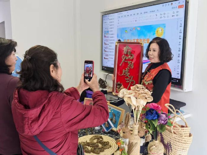 除了切身觀摩與聆聽講解,成員們還在于老師的指導下親身參與體驗了草編創作。不過是簡單的扎與結,幾片玉米葉就化作了栩栩如生的小金魚。“這下擇完菜剩下的葉子也有用了!”現場一位阿姨驚喜地說。