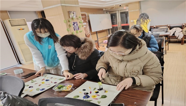 科普環節結束后,其余志愿者有條不紊地籌備拓印材料。她們提前精選了植物材料,注水、溶解明礬,固色、浸泡、輕柔擦拭多余水漬,每一個步驟都適配老年人的動手能力。為了讓老人們更快融入,志愿者們不僅彎著腰幫老人們擺好材料,還邊講邊示范。一張張擺放著各色紋樣的帆布包與工具放在老人們面前,一場兼具傳統韻味與生活溫度的拓印體驗正式開始。老人們很快沉浸其中,專注地擺弄著花葉進行著創作。活動接近尾聲時,不少老人仍拿著自己的作品互相拍照、分享心得。現場有阿姨拉著志愿者的手說;“跟你們年輕人待在一起,不僅能長知識,還能了解咱們中國的非遺文化,做手工特別有意思,希望你們能常來這邊開展活動。”