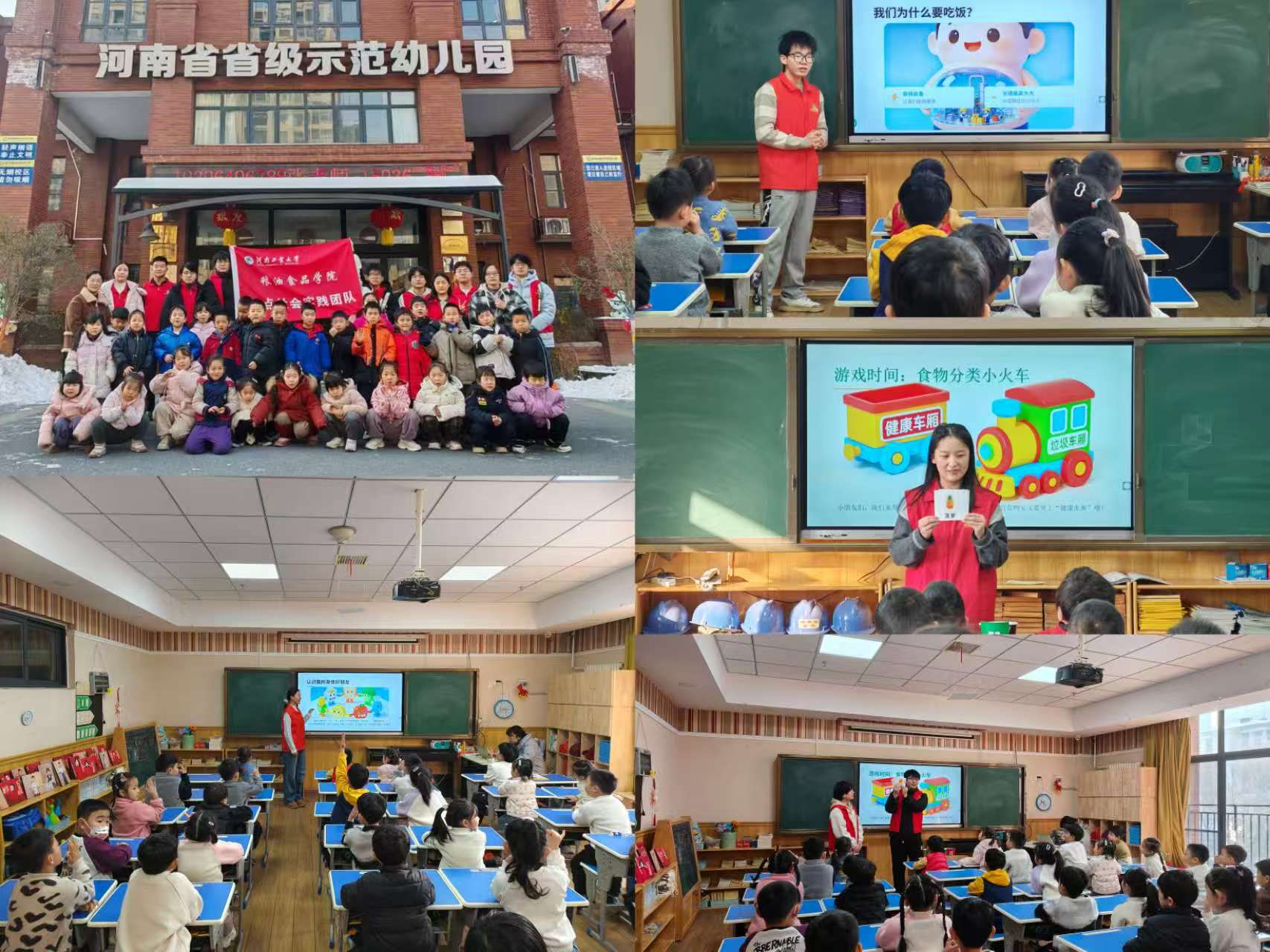在做好社區科普的同時,先鋒隊聚焦幼兒食育啟蒙,在主場地與六地分場地同步開展幼兒園食育科普專場,以趣味互動形式打造沉浸式課堂,讓健康飲食理念根植幼兒心中。1月20日,鄭州高新區楓楊嘉幼兒園、鴻容幼兒園主場地專場同步開啟,隊員們緊扣幼兒認知特點,以活潑的食育兒歌、生動的動畫短片暖場,搭配趣味拍手小游戲快速拉近與孩子的距離;手持“食物紅綠燈”教具,用淺顯易懂的語言講解健康食物與高糖高油零食的區別,穿插趣味提問激發孩子參與熱情;組織“食物分類小火車”游戲、“我的健康餐盤”手工活動,讓孩子們在動手操作中直觀學會辨別健康食品、理解膳食均衡的意義;顒荧@得園方與家長的高度認可,實現了“玩中學、學中悟”的食育啟蒙目標。