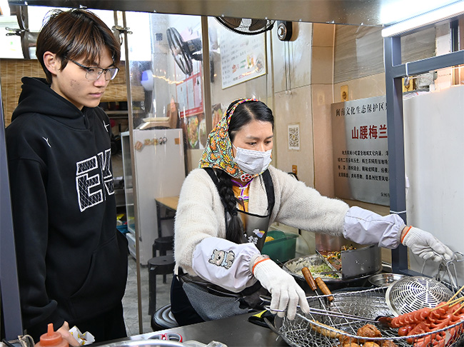 二、海絲潮聲里,古厝風味的古今交響 海絲之路曾載著香料、食材與風味穿越重洋,閩南煙火氣正是這千年商路的鮮活遺存。實踐隊深知,讀懂海絲不僅要探古跡、溯文脈,更要于市井風味中捕捉文化交融的印記,于是深入梧林傳統村落與泉州西街。古厝改造的美食空間里,面線糊裹著蝦蟶的海味鮮醇,是海洋饋贈的直白表達;綠豆餅藏著蟳埔女婚嫁的甜意,肉燕承載節慶團圓的溫情,每一味都沉淀著海絲貿易帶來的食材交融與民俗傳承。老字號餅鋪里,師傅揉搓面團的力道藏著世代堅守;金魚巷浮粿攤前,我們親手翻面控油,在滋滋油鍋聲中讀懂市井美食的傳承智慧。而文創包裝、新潮搭配讓古早味煥發新生,恰如千年海絲始終包容共生,讓傳統風味在當代持續傳遞文化溫度。