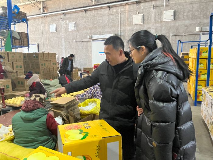 短暫休息后,四季鮮果庫的楊照紅經理接待并帶領隊員們實地考察了果庫內部,深入了解酥梨從鮮果儲存、分類包裝到物流發貨的全流程,團隊成員們隨后通過提問交流,詳細了解酥梨的保存時長、存儲要點、銷售路徑與實際售賣情況,把握酥梨產業的市場發展趨勢。楊照紅經理表示:“我們的酥梨不僅銷往國內,更發往海外多個國家,酥梨的銷售已經走向世界。”