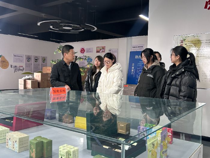 1月17日,團隊前往陜西匠秦古匠心食品有限公司開展實地調研與深度交流。公司新媒體部門負責人張綿首先為團隊介紹了企業在新媒體運營、產品銷售及產品設計等方面的布局與成果。隨后,公司董事長楊建平親自帶領團隊參觀產品展示區,并結合產品實物,詳細講解了企業圍繞陜西本土特色農產品開展產品開發、品牌塑造與市場推廣的實踐經驗。在隨后的座談交流中,團隊圍繞“皮影文化如何賦能酥梨等農產品包裝與營銷”這一核心議題,與企業方展開深入探討。團隊成員結合前期對皮影藝術特征的研究積累,提出了若干初步融合思路。企業方從市場角度對方案的可行性給予了積極反饋,雙方就后續在文創設計、品牌推廣聯動方面達成初步合作共識,為“非遺+農產品”模式的落地打通了關鍵的企業合作通道。