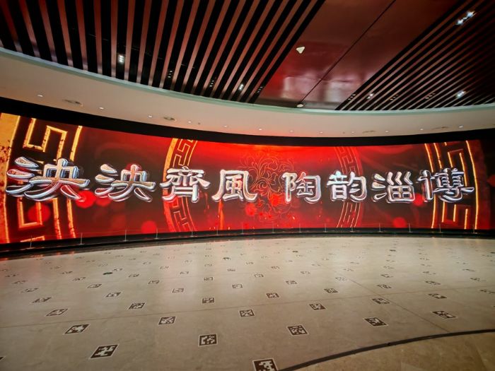 圖為實踐隊員拍攝淄博陶瓷琉璃博物館一樓大廳宣傳語。黃姿童 供圖