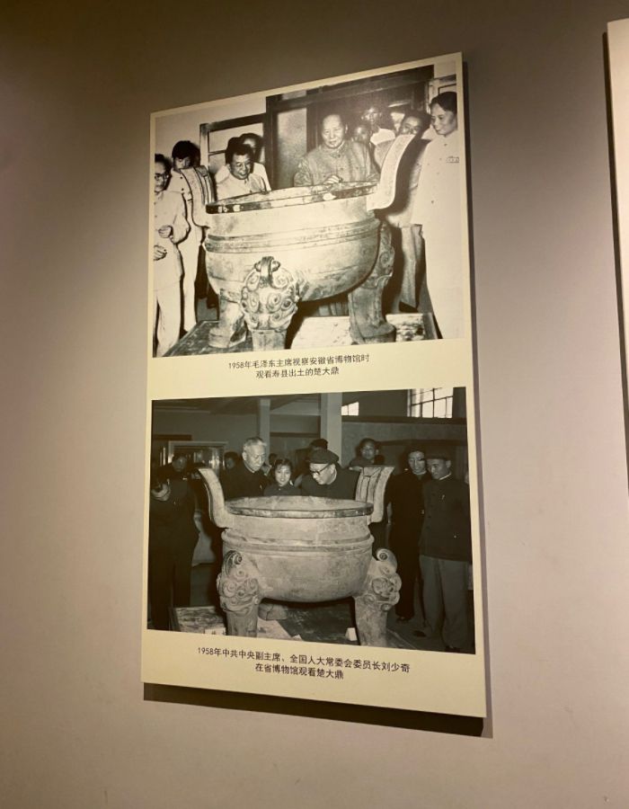 圖為毛主席以及劉少奇副主席在壽縣博物館參觀楚大鼎的情景