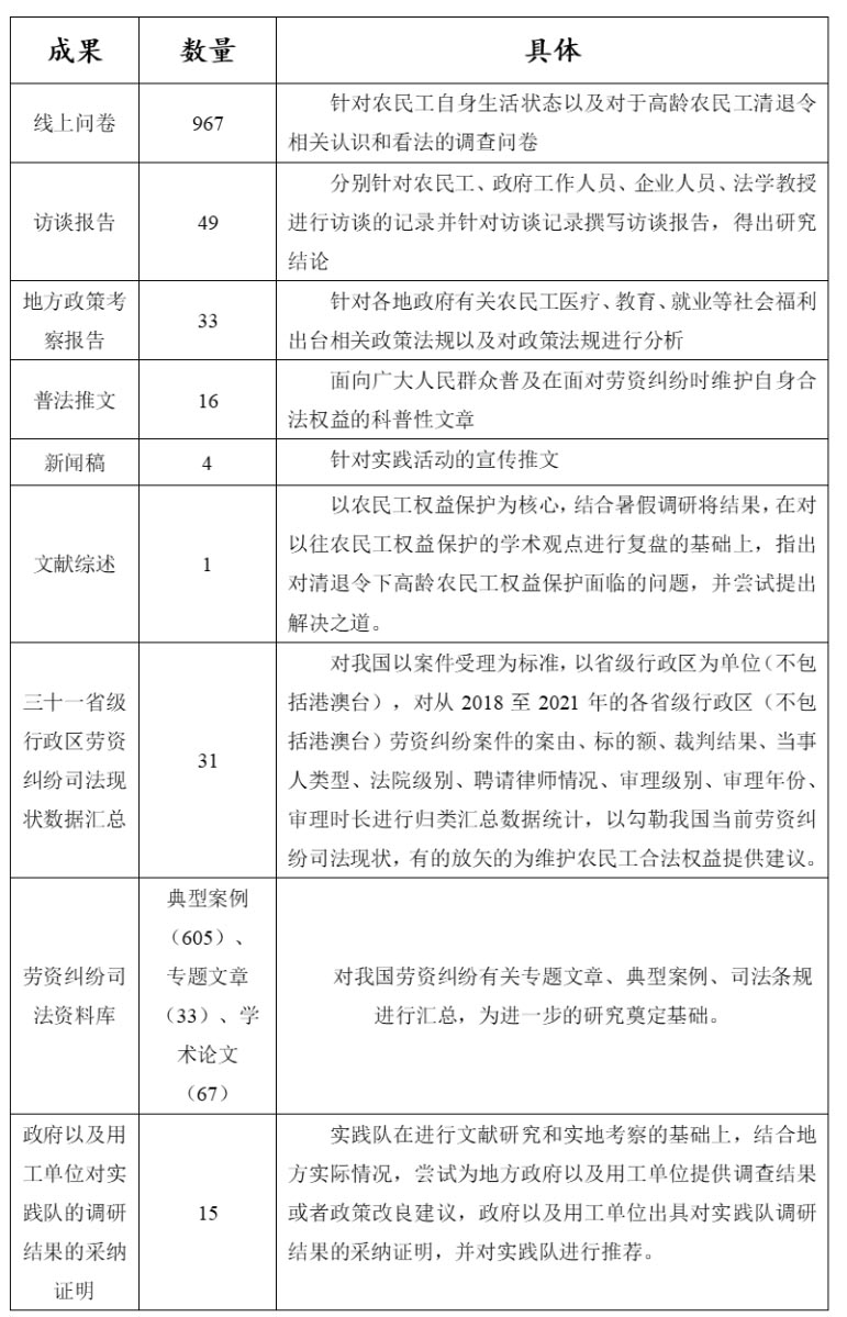 本次實踐以2022年上半年全國部分地區出臺的建筑領域超齡農民工清退政策為背景,調查在此政策實施背景下多地市的清退令及其配套措施的執行情況,探究全國各地農民工的就業與權益保障狀況,并通過問卷形式收集農民工群體對于該政策所持態度,以了解在清退令對高齡勞動者在就業、社會保障以及社會經濟、穩定、就業等方面的影響,最終形成地方政策報告與政策效果評估,為超齡農民工清退政策及其相關配套措施的進一步完善奠定基礎。