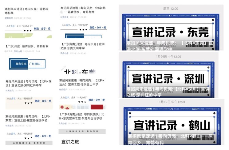 2022年10月,伴隨著正式文件的下達,北京科技大學2023年“把我的大學帶回母校”寒假招生宣傳實踐活動正式展開。北京科技大學12名來自廣東地區的大一大二學生組成“粵向貝殼”分隊,作為北京科技大學的代表向廣東各個地區的高中進行宣傳。此次寒招宣傳活動以“把我的大學帶回母校”為主題,小隊以廣東地區為重心,宣傳方式以網絡傳播為主,線下宣講為輔,充分利用每個成員的優勢,展開有秩序、有計劃、有執行的寒招工作。